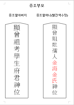 - 증조부(증조할아버지): 顯曾祖考(현증조고)