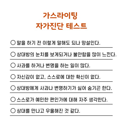 지금까지 가스라이팅 뜻과 유래, 예시 등을 알아봤습니다. 가스라이팅을 당하지 않으려면 요구사항이 상식을 벗어나진 않는지, 모든 잘못을 나에게 돌리진 않는지 따져가며 상대방의 말에서 진실과 거짓을 구분해야 해요.