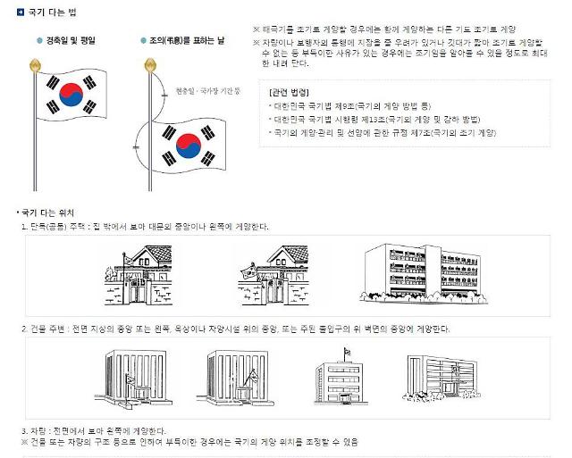 • 건물 주변은 전면 지상의 중앙 또는 왼쪽에 게양, 옥상이나 차양시설 위의 중앙이나 위 벽면의 중앙에 게양