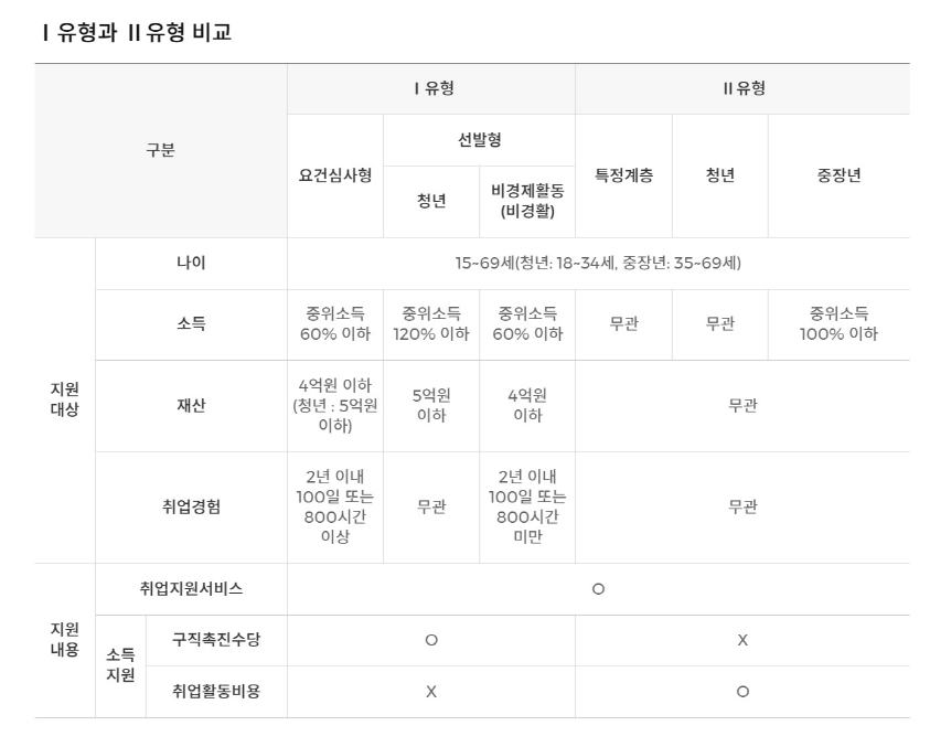 국민 취업지원제도에 지원하는 경우 소득과 재산 기준으로 1유형과 2유형으로 구분이 되는데요, 1유형과 2유형은 대상과 조건이 각각 달라서 본인에게 해당되는 유형은 무엇인지 확인해 보는게 좋습니다.