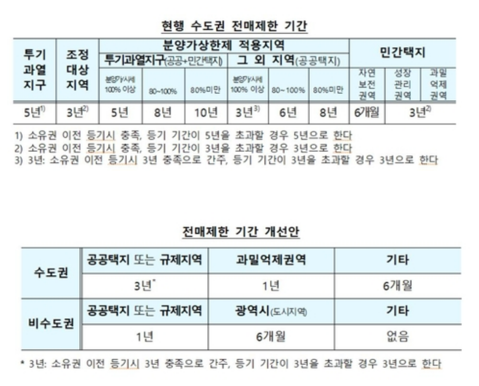 그러나 이번 대상 지역 해제로 강남3구·용산 73개동만 남게 되었는데요, 이들 지역을 제외한 서울 내 분양 단지는 전매제한 기간이 최대 10년에서 1년으로 줄어들게 되었고 실거주 의무는 아예 폐지되었습니다. 전매제한 기간도 수도권 규제지역은 최대 10년에서 3년으로, 비수도권은 4년에서 1년으로 축소하며 원래 전매제한 완화는 시행령, 실거주 의무는 법을 바꿔야 하는 사안이지만 전매제한과 실거주 의무가 남았더라도 소급 적용해 완화된 규정을 적용한다는 방침입니다.