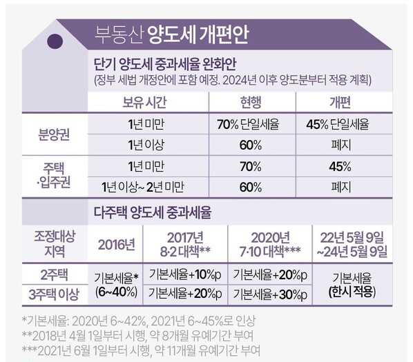 양도세의 경우 2024년 5월 9일까지 양도세 중과를 한시적으로 유예하겠다고 밝힌 만큼 조정대상지역 내 다주택자의 경우에도 양도세 중과에서 자유로웠는데 정부의 규제지역 해제로 인해 다주택자들은 유예기간과 관계없이 기본세율이 적용되게 되었습니다. 다만 1세대1주택자는 주택 취득시점을 유의해 처분해야 하는데요, 조정대상지역에서 해제가 됐다고 거주요건 등을 무시한 채 무조건 주택을 처분하면 안되고, 조정대상지역 해제 이전 시점에 주택을 구입했다면 반드시 2년 보유 2년 거주 요건을 충족하되, 비과세 혜택을 부여 받게 된 것이니 양도세를 엄청난 규모로 물게 되는 일이 없도록 주의하시기 바랍니다.