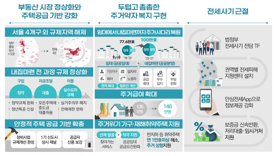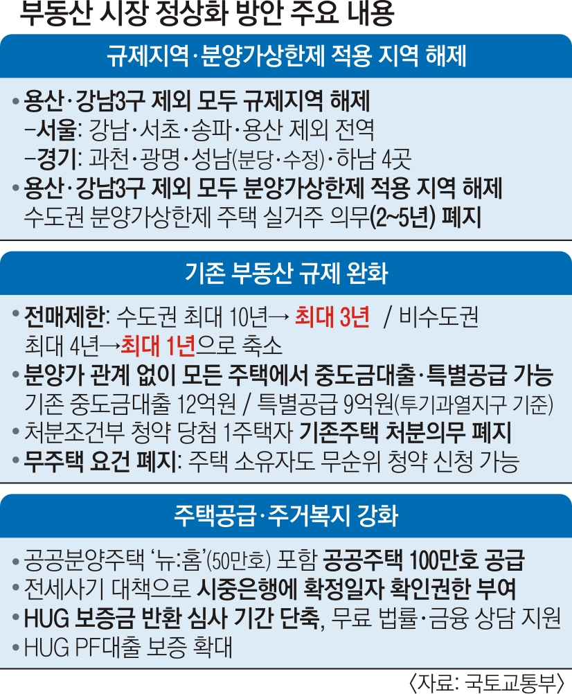이에 뒤이어 올해 첫 부동산 대책으로 규제지역 해제가 또 한 번 발표된 것입니다. 골자는 부동산 규제지역을 서울 강남 3구(서초·강남·송파)와 용산구만 빼고 전면 해제한다는 것인데요, 이는 규제지역을 전임 정부 이전 수준으로 환원한 것으로 세제, 청약, 거래 등 집을 사고파는 모든 과정에 대한 규제가 풀리게 된 것으로 볼 수 있습니다.