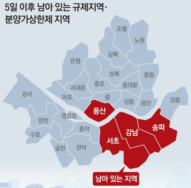 이번 규제지역 해제 발표에 따르면 서울 강남구·서초구·송파구·용산구를 제외한 나머지 21개 자치구와 경기 전 지역이 규제지역에서 전면 해제되는 것이며 관보 게재가 완료되는 오는 5일 0시부터 효력이 발생합니다.