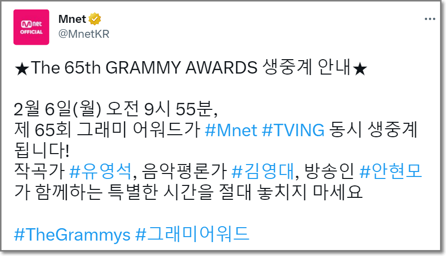 그래미 어워드 2023 중계는 작년에 이어 티빙이 제 65회 그래미 어워드를 국내 OTT 독점 생중계합니다.