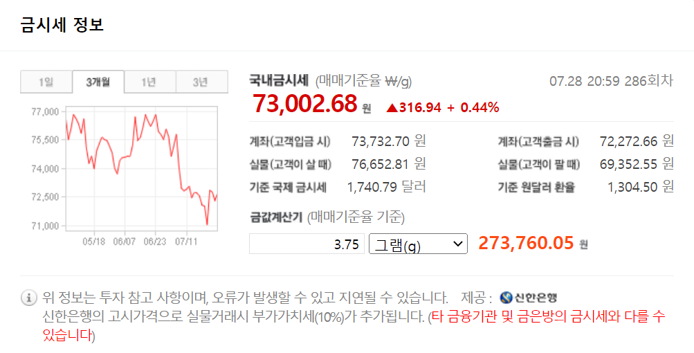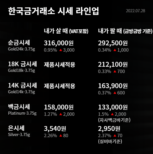 먼저 7월 28일을 기준으로 금시세 금값 한돈가격은 순금 1돈(Gold24k-3.75)을 31만 6000원에 매입할 수 있습니다. 반면 순금 1돈을 판매할 경우에는 29만 2500원에 거래 가능합니다.