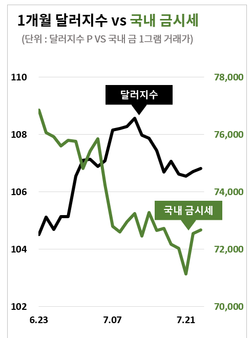 연준의 공격적인 금리 인상으로 달러 가치가 올라가자 미국 이외 지역의 투자자들에겐 달러로 시세가 매겨지는 금값이 상대적으로 더 오른 것처럼 느껴지기 때문에 금 매수가 더욱 부담스러워졌다는 것이 전문가들의 분석입니다.