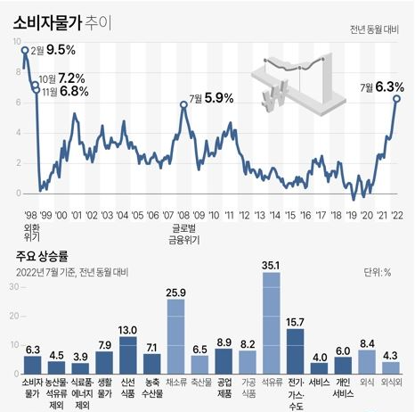 또한 전문가들 사이에서는 한은이 현재 4.5%인 올해 소비자물가 상승률 전망치를 5%대까지 높일 것으로 보고 있는데 만약 올해 5%대 물가상승률이 현실로 나타나면, 이는 1998년(7.5%) 이후 24년 만에 최고 기록입니다.
