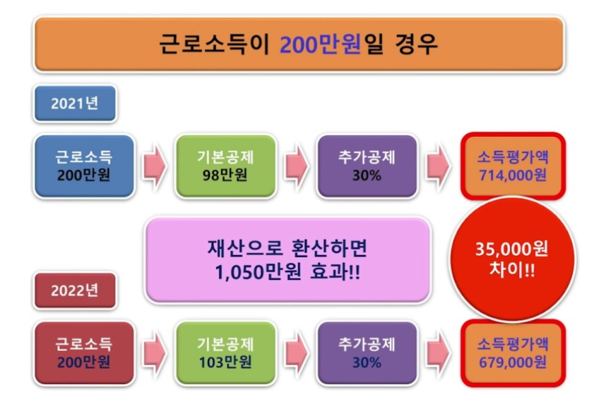 근로소득 공제액의 경우 2021년에는 98만원이었는데 올해 최저임금이 9160원으로 상향 조정되었기 때문에 103만원으로 샹항된 것입니다.