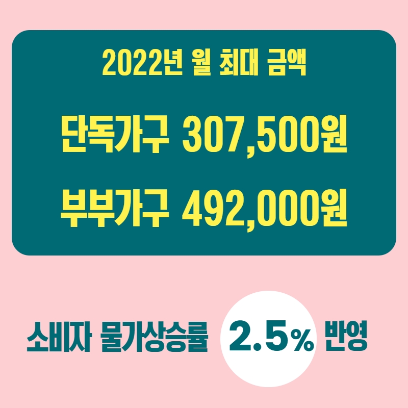 2022년 기초연금 월 최대 지급액은 단독가구(1인가구)의 경우 최대 30만 7,500원, 부부가 함께 사는 가구는 최대 49만 2천입니다. 이는 최대치를 말하는 것이며 최대금액에서 소득인정액에 따라 수령하는 연금이 차감되는 거라고 보시면 돼요.