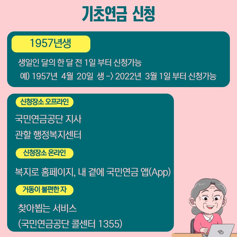 기초연금은 복지로를 통한 온라인(모바일)으로도 신청이 가능하지만 조건을 보는 부분이 많아 내용이 쉽지 않습니다. 따라서 되도록이면 주소지 관할 주민센터 또는 가까운 국민연금공단 지사에 방문하시는 걸 추천드려요.