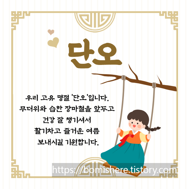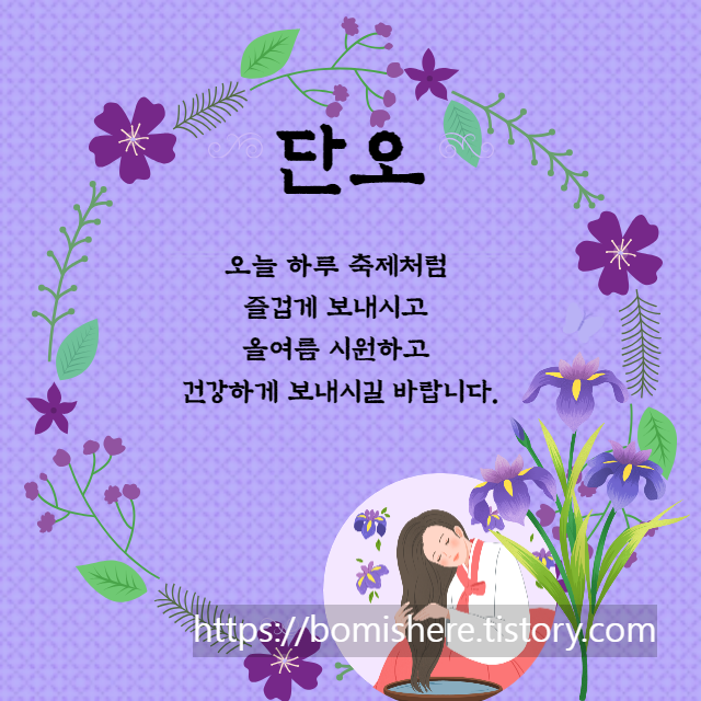 지금까지 단오 인사말 이미지 문구 모음을 소개해 드렸습니다. 단오는 건강한 여름을 보내려는 기원과 준비의 성격이 강한 명절이어서 단옷날 액운을 떨치고 건강을 기원하는 의미에서 창포물에 머리를 감는 등의 풍습이 있습니다. 또한 그 한해 모기에 물리지 말라는 뜻으로 그네를 뛰는 것이라고 하며 이날 양기가 가장 강한 쑥을 뜯어 1년의 약용 재료를 마련한 것이라고 해요.