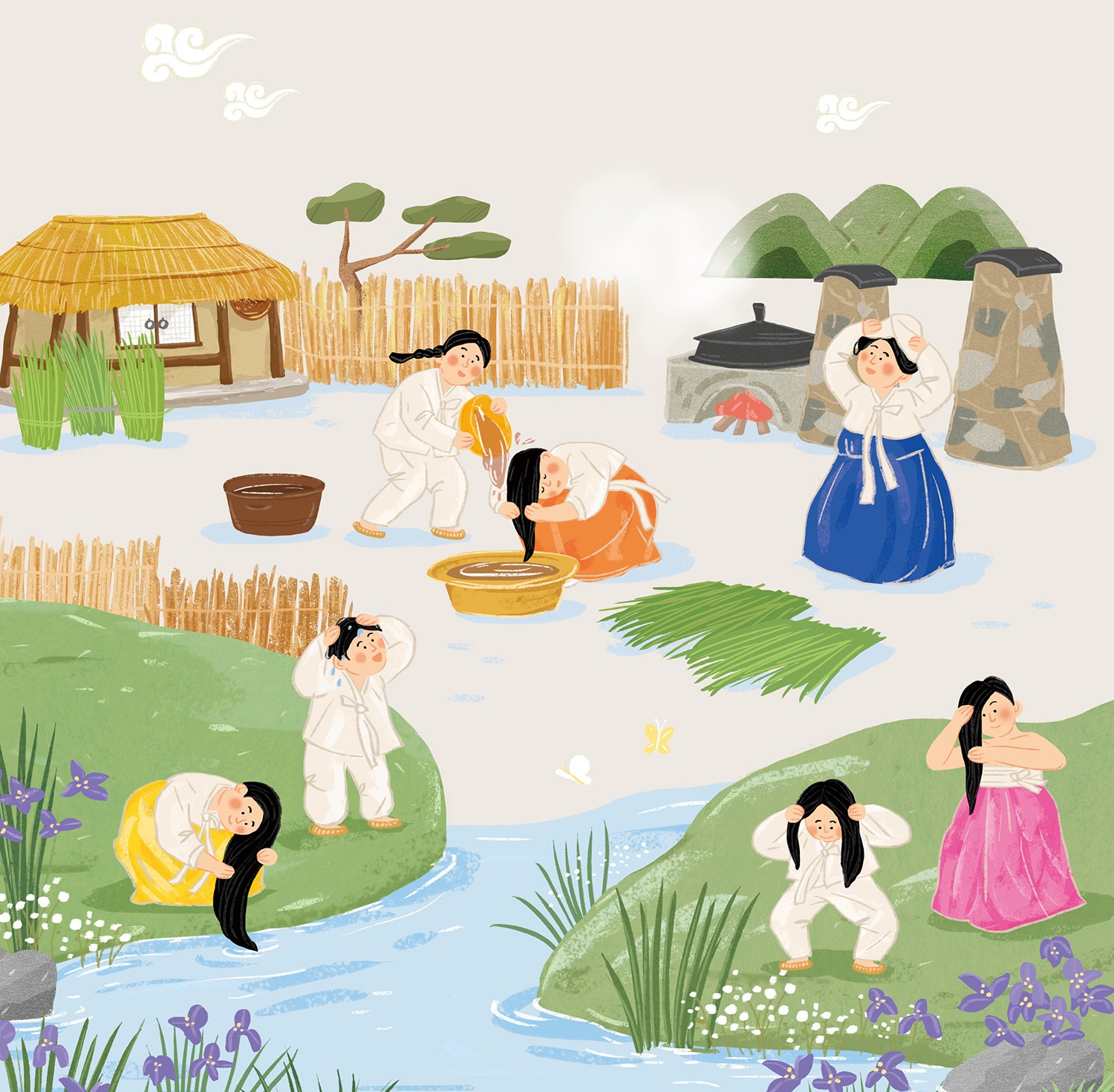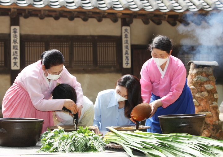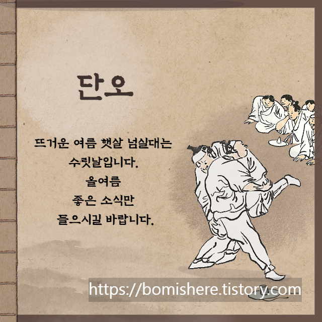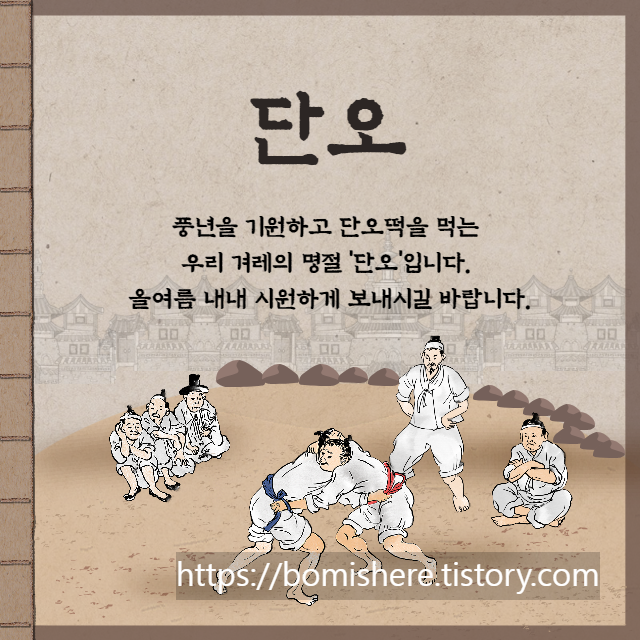 여자는 창포물에 머리 감고 남자는 씨름을 하며 여름 맞이 준비를 하던 단오입니다. 본격적인 한여름 무더위 이겨낼 단오 절식도 꼭 챙겨 드시고 건강하고 행복한 여름 보내시길 바랍니다.