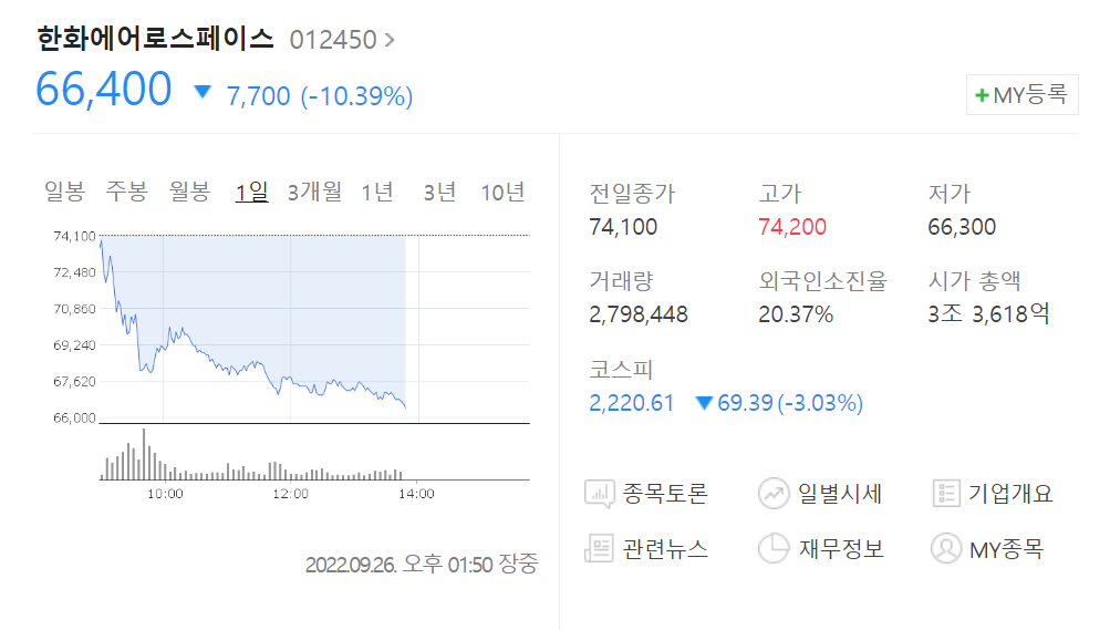 구체적으로 한화에어로스페이스 주가는 9.18%(6800원) 내린 6만7300원, 또 다른 방산주인 한화시스템(-4.53%)과 한화(-3.83%) 주가도 3% 이상 내리고 있으며 한화투자증권(-3.75%) 등 금융계열사 주가도 코스피지수보다 크거나 비슷한 하락폭을 보이고 있습니다.