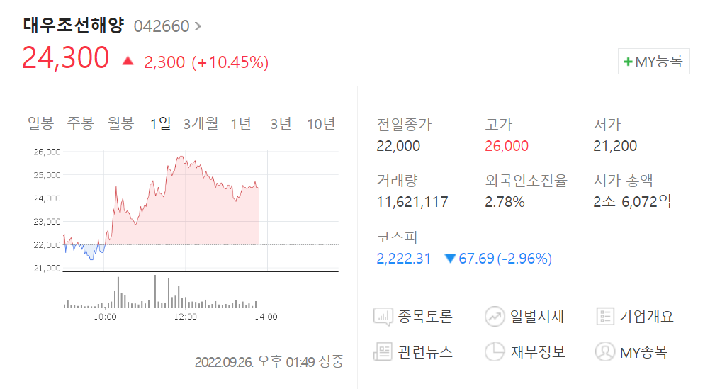 대우조선해양 주가는 최근까지 2만1000원선에서 유지되어 왔으며 지난 2021년 3만원을 넘었던 것과 비교하면 큰 차이가 있는 셈입니다. 그러던 중 오늘 한화 매각 소식이 알려지면서 현재 대우조선해양 주가가 24000원대까지 급상승 중에 있습니다.