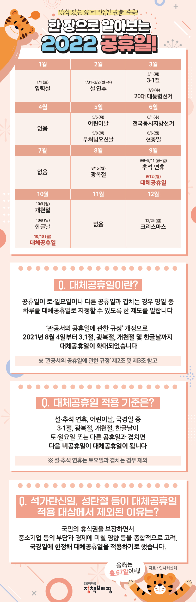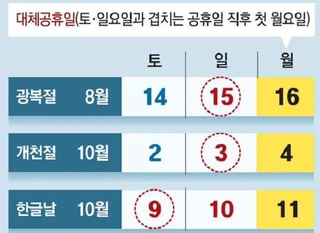 2021년 8월 4일부터 ‘관공서의 공휴일에 관한 규정’ 개정으로 3.1절, 광복절, 개천절 및 한글날까지 대체공휴일이 확대되었어요.