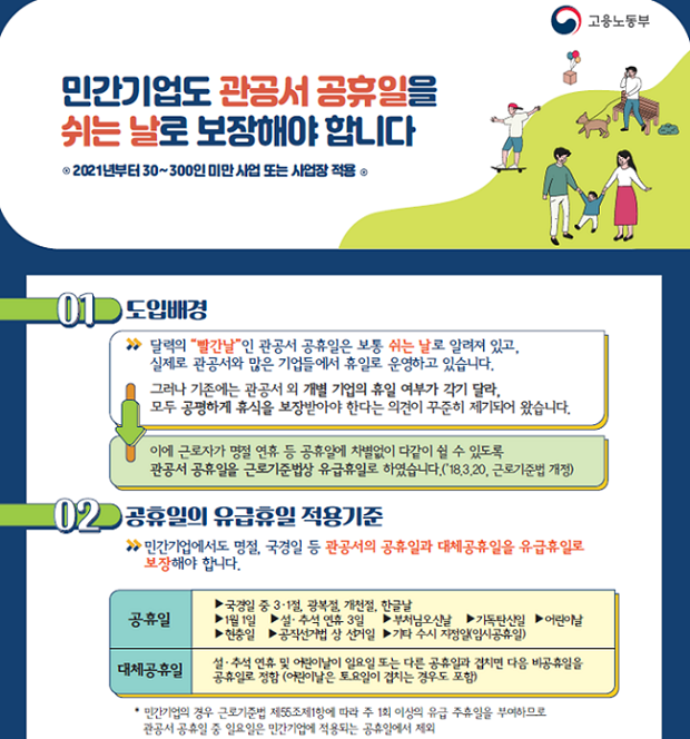 민간기업에도 역시나 대체공휴일이 확대 적용되게 됩니다. 근로기준법상 유급휴일 같은 경우 관공서 공휴일 규정에 의거해 2020년 1월부터 상시 300인 이상으로, 2021년 1월부터는 30인 이상, 올해는 5~29인 기업은 관공서 공휴일을 유급휴일로 보장받게 되었습니다.