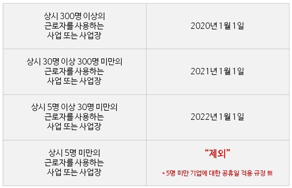 5인 이상 작업장부터 대체공휴일 적용 대상이 되며 4인 이하 기업인 영세사업장까지는 대체공휴일 적용대상 확대에 무리가 있다고 판단되어 포함되지 않은 것이라고 합니다.