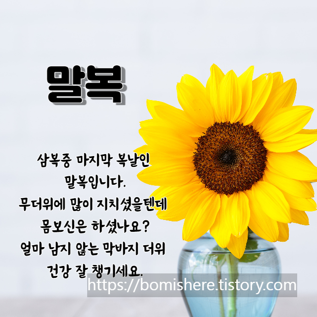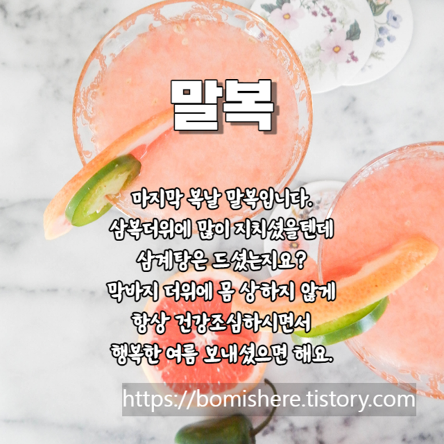 주변분들과 소개해 드린 말복 인사말 이미지로 안부 나누시면서 태풍이 오는 마지막 여름의 더위, 말복을 무사히 잘 버티시고 남은 8월도 건강하게 보내시기 바라니다.