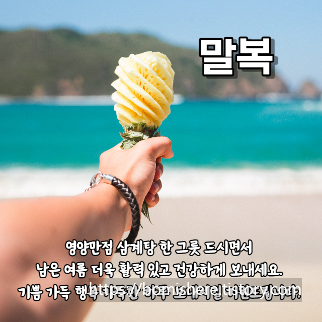 말복 인사말 이미지 복날 아침 인사 모음을 소개합니다. 초복이 든 것이 엊그제 같은데 벌써 삼복지간의 마지막인 말복입니다. 삼복 가운데 첫 번째로 드는 복날로 여름이 시작됨을 의미하는 초복은 지난 지난 7월 11일이었는데요,