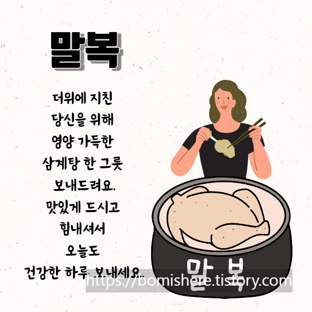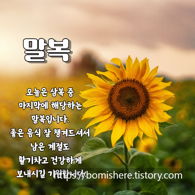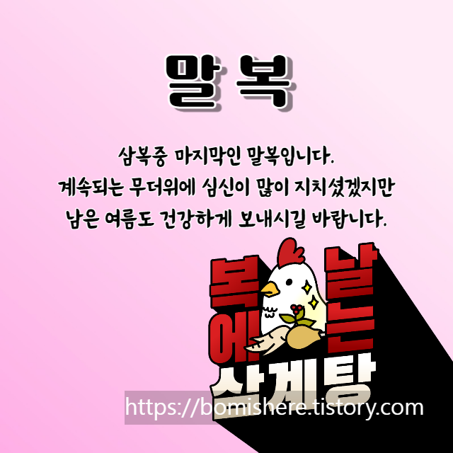 지금까지 말복 인사말 이미지 복날 아침 인사 모음을 소개해 드렸습니다. 말복은 삼복(三伏) 가운데 마지막에 드는 복날로, 삼복은 1년 중 날씨가 가장 더운 때를 말합니다. 24절기와 일진으로 지정하는 세시 풍습의 일종인데요, 입추가 지난 뒤 첫 번째 경일(庚日)에 드는 것을 말복이라고 칭합니다.