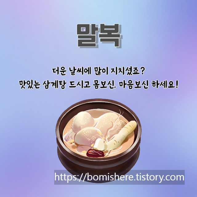 ♡ 오늘은 삼복 중 마지막 복인 말복이라고 합니다. 계속되는 더위에 많이 지치시죠? 오늘은 태풍 소식에 몸보신 하러 잠시 외출을 다녀올수나 있을지 더욱 걱정이 되기도 합니다. 태풍이 지나고 안전해질 때 까지는 꼭 집에서 머무르면서 푹 쉬시고, 말복 날 건강히 더위를 이겨낼 수 있도록 재충전 잘 하시기 바랍니다.