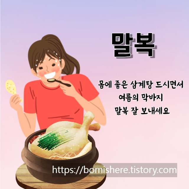 ♡ 오늘은 삼복 중 마지막 복인 말복이라고 합니다. 계속되는 더위에 많이 지치시죠? 오늘은 태풍 소식에 몸보신 하러 잠시 외출을 다녀올수나 있을지 더욱 걱정이 되기도 합니다. 태풍이 지나고 안전해질 때 까지는 꼭 집에서 머무르면서 푹 쉬시고, 말복 날 건강히 더위를 이겨낼 수 있도록 재충전 잘 하시기 바랍니다.