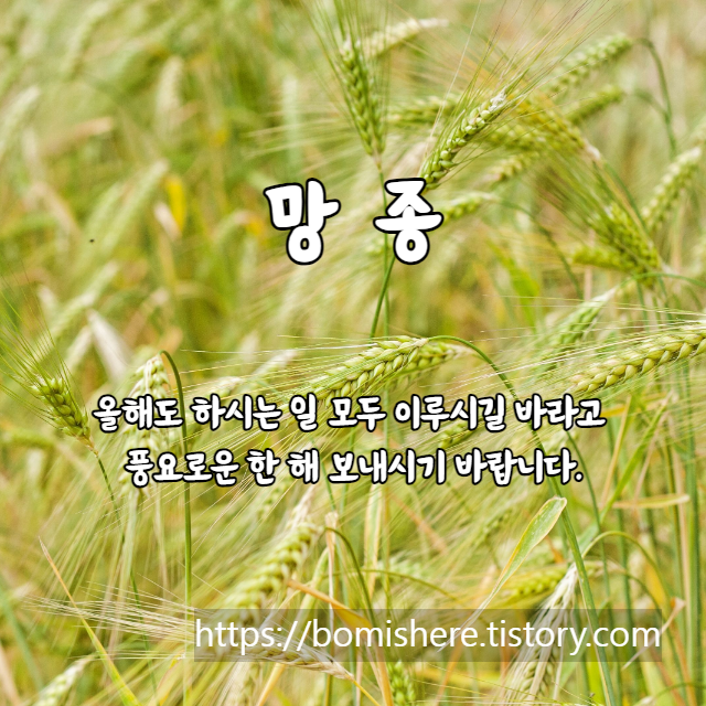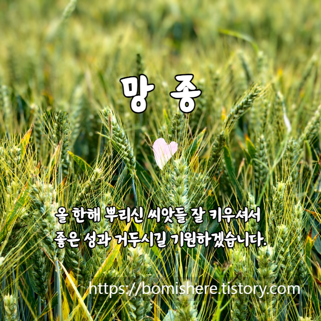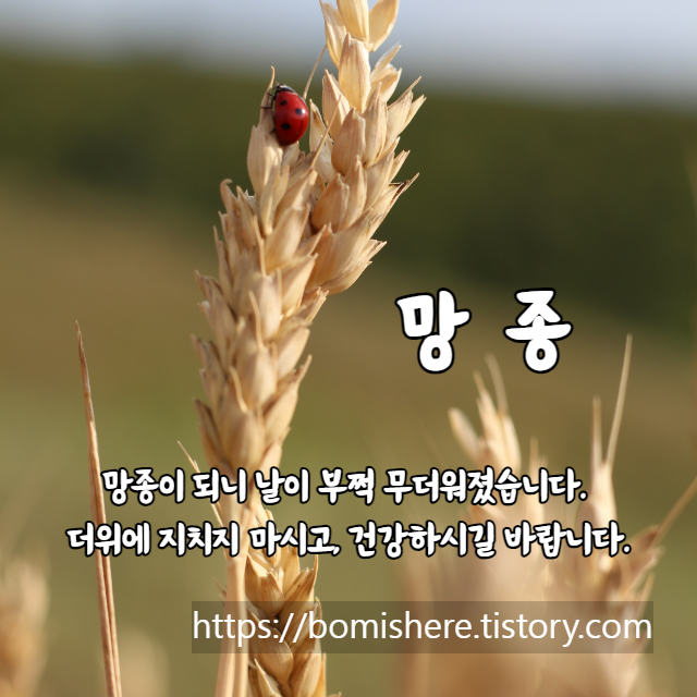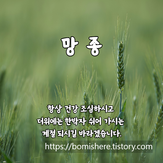 망종 인사말 이미지 (망종의 뜻 절입시간)을 소개합니다. 망종은 소만(小滿)과 하지(夏至) 사이에 들며 음력으로 5월이지만 양력으로는 6월 6일 무렵에 드는 절기입니다.