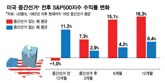 지난주 미국 3대 지수는 11월 FOMC 회의 이후 최종 기준금리가 예상 수준보다 더 높을 수 있다는 언급이 나오면서 일제히 급락한 바 있습니다. 이제 시장은 8일(현지시간) 예정된 미국 중간선거 결과에 관심을 집중하고 있는데요, 통상 중간선거 이후에는 선거 결과에 상관없이 몇 달간 주가가 오르는 경향을 보였습니다.