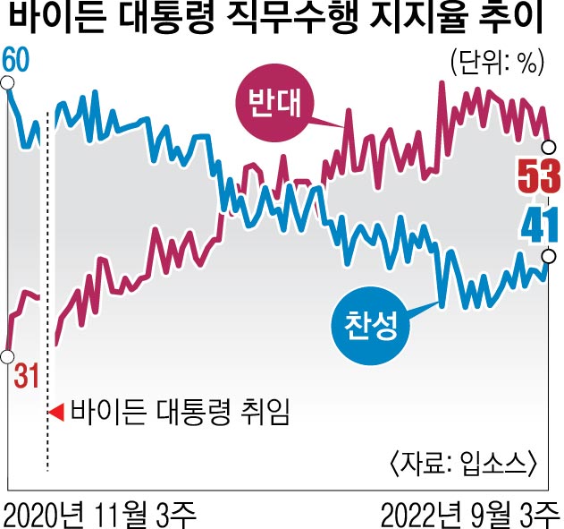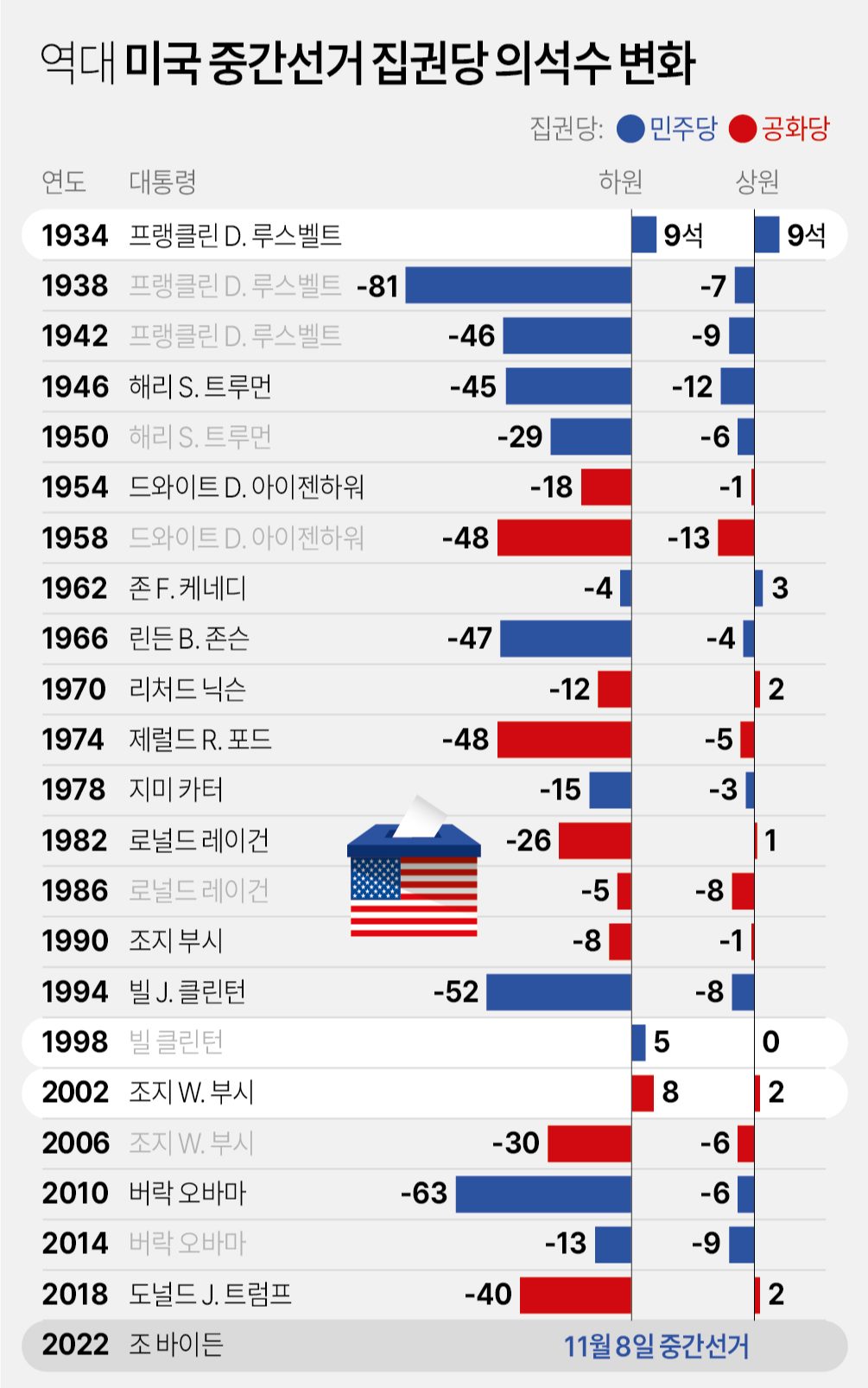 통상 중간선거는 ‘현직 대통령의 무덤’이라고 일컬어집니다. 정권 견제론 작동으로 집권당이 의석을 잃고, 의회 주도권을 내주기도 하는 일이 빈번하게 벌어졌기 때문인데요, 1862년 이래 여당이 하원에서 의석을 늘린 중간선거는 단 세 번(1934, 1998, 2002년)뿐이었다고 합니다. 게다가 올해는 40년 만의 인플레이션으로 바이든 대통령 지지율도 낮아, 공화당의 상·하원을 모두 장악할 것이라는 시나리오가 상반기까지는 대세였습니다.