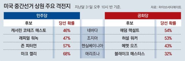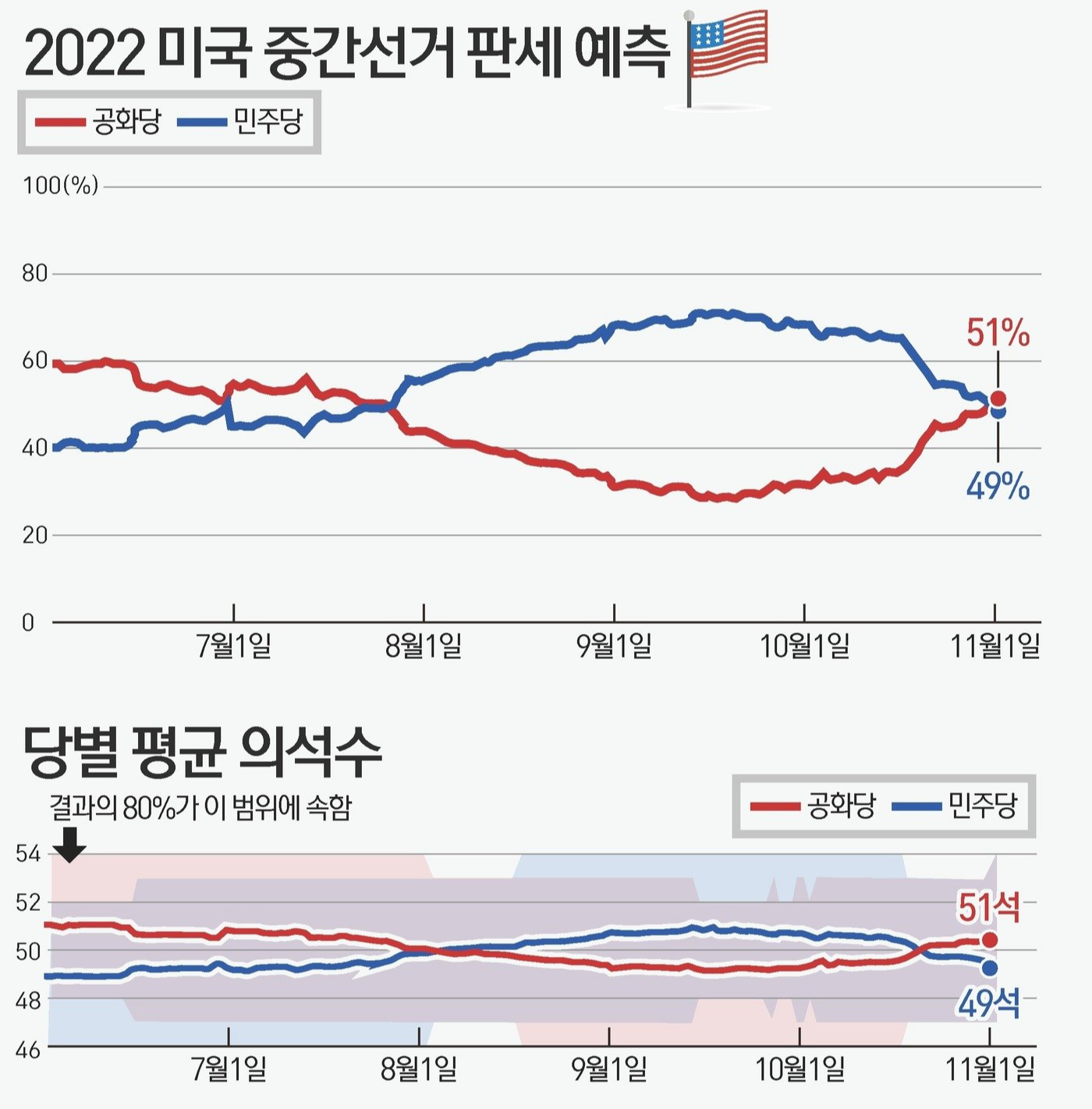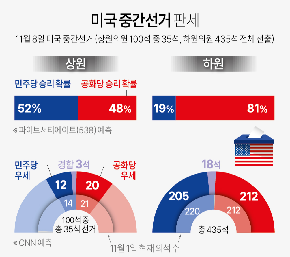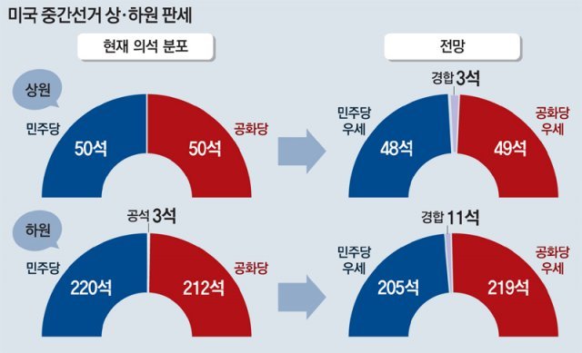 현재 전문가들의 예상은 공화당이 10~20석 정도로 하원을 장악할 것이지만 상원은 민주당이 방어할 가능성이 커졌다는 전망이 나오고 있는데요, 50석을 지키거나 1석을 추가할 수도 있다는 분석입니다. 여론조사 기관들의 시뮬레이션 결과 100개 중 67개는 민주당 승리, 33개는 공화당 승리로 나오기도 했고 민주당 승리 확률이 80%로 나타난 조사도 있습니다.