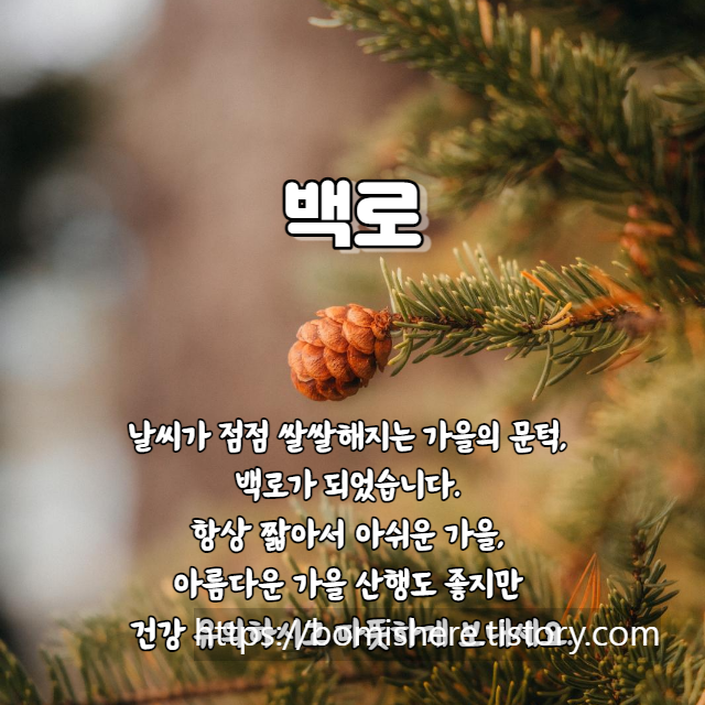 ♡ 백로가 되어 가을이 깊어갑니다. 산과 들에는 열매가 잘 익었고, 나무에는 단풍이 물들었습니다. 가을의 향기를 느끼며 행복한 하루 보내세요.
