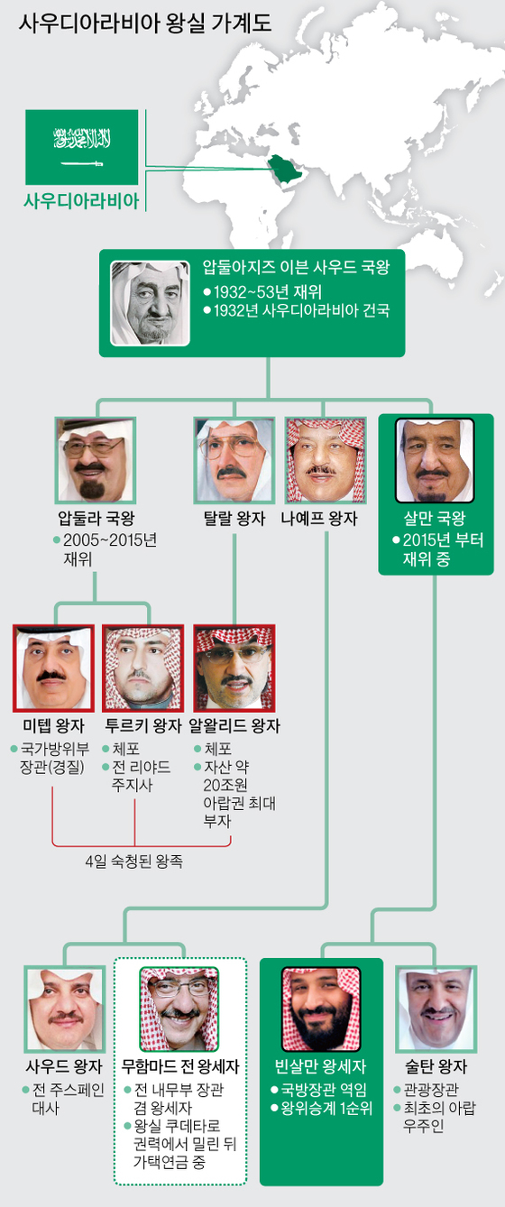살만 국왕이 즉위했을 때 왕세자는 빈 살만의 사촌형인 무함마드 빈 나예프라는 인물이었는데 그는 미국에서 공부하고 FBI 보안과정을 마친 미국통으로 알려져 있습니다. 하지만 2017년 빈 살만이 왕세자가 되면서 모든 직위에서 해임되었고 이후 빈 살만은 강경한 '반부패 운동'을 주도해 왕족들을 숙청해 왔습니다. 부정부패 혐의가 있는 사우디 왕족들을 호텔에 가두고 왕족들이 부정부패로 모은 재산을 국고에 환수하는 조치를 단행한 것인데요, 이는 잠재적 정적들을 제거하기 위한 것으로 풀이되고 있습니다.