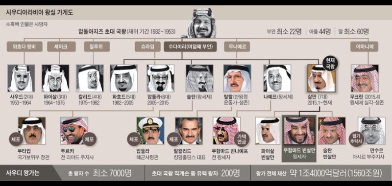 사우디 법에는 형제상속을 강제하는 규정은 없으나 초대 국왕인 이븐사우드가 호족과의 정략결혼으로 세력을 키워 1932년 사우디 왕국을 창건하면서 결혼한 부인이 23명, 아들은 45명에 달했습니다.