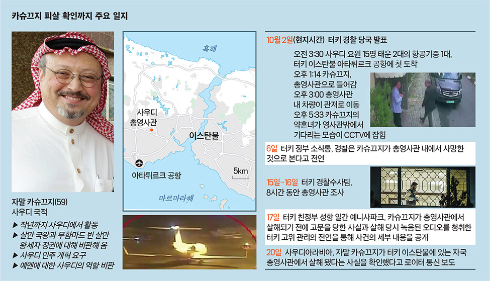 이 사건은 사우디 왕실을 비판하던 언론인 카슈끄지를 진혹하게 살해한 사건으로, 미국 CIA에서는 빈 살만 왕세자를 암살 배후로 지목하였고 바이든 대통령은 대선 후보 시절 ‘사우디를 국제 사회의 '왕따'로 만들겠다’고 공연하기까지 했다고 합니다.