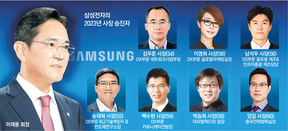 먼저 지난 5일 공개된 삼성전자 임원인사 명단 (2023년)은 이재용 회장 취임 뒤 첫 정기 사장단 인사여서 주목을 받아 왔는데요, 삼성전자를 비롯한 삼성 전자 계열사 인사에서 30대 상무와 40대 부사장 등을 대거 발탁하여 직급이나 연차에 상관없이 능력 있는 인재를 적극 등용했다는 평가가 나오고 있습니다. 한 마디로 ‘뉴 삼성’ 진용을 구축했다는 평가입니다.