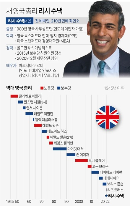 새 영국 총리 리시 수낵(42) 전 재무장관은 인도계 이민자 가정 출신이지만 학력과 경력 면에서는 보수당의 전형적 엘리트 코스를 거쳐온 것으로 평가받고 있습니다. 게다가 1980년 5월생으로 올해 만 42세라고 하는데 이는 1812년 로버트 젠킨슨(만 42년 1일) 이후 210년 만에 최연소 총리에 오르는 것입니다. 과거 데이비드 캐머런과 토니 블레어 전 총리가 취임 당시 44세였다고 하구요, 전임인 리즈 트러스는 47세, 보리스 존슨은 55세였으니 나이가 점점 어려지는 추세네요.