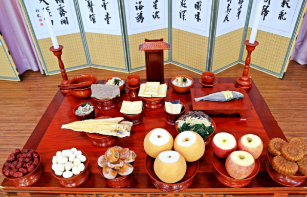 성균관은 떡국, 나물, 구이, 김치, 과일 4종에 잔, 시접(수저 담는 놋그릇) 등 9종을 올린 차례상을 예시로 제시했습니다.