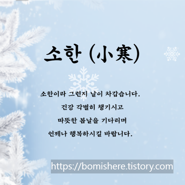 ※ 소한 인사 이미지 (아침 인사말)은 무료 이미지를 활용하여 직접 제작하였습니다. 주변분들과 인사 나누시는데 사용하시는 것은 좋지만 개인 블로그나 카페로 허락없이 가져가실 경우 엄중히 조치하도록 하겠습니다.