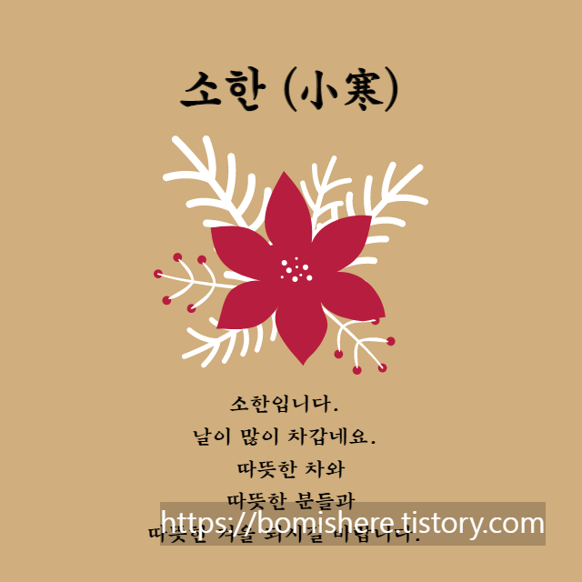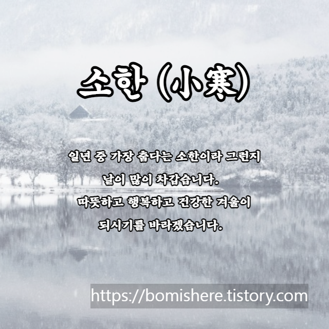 새해이기도 하고 한 해의 첫 절기이기도 한 만큼 새해 인사를 미처 못하셨거나 날씨가 가장 추울 때인 소한에 걱정되는 분들이 많으실 것 같아 소한 인사 이미지를 직접 만들었어요. 주변분들과 소한 아침 인사말 나누시면서 올해 덕담 주고 받으시면 참 좋을 것 같습니다. 소한 인사 이미지 (소한 아침 인사말)을 바로 소개해드릴게요.