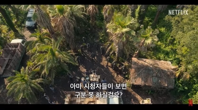 수리남 촬영지를 제주도로 선택한 것에 대해 윤종빈 감독은 가족 여행으로 제주도를 갔었는데 남미로 꾸밀 수 있을 것 같다는 생각이 문득 들었다고 해요. 직접 야자수를 재배하며 세트를 구현하다 보니 남아메리카와 정말 비슷해서 팀들도 다들 놀랐다고 합니다.
