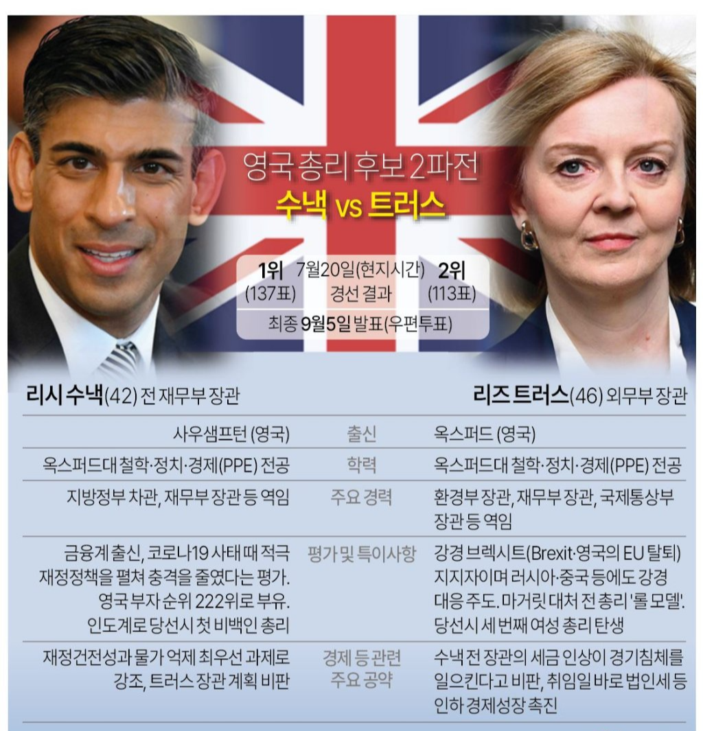 현재 리즈 트러스(47) 외무부 장관과 리시 수낙(42) 전 재무부 장관 두 사람을 후보로 놓고 지난달 1일부터 한 달간 약 16만명의 영국 보수당원들이 우편과 인터넷 등으로 직접 투표를 했는데요, 주말 내내 개표가 이뤄진 상황이며 이제 보수당 선거관리 위원회의 최종 검증이 남아 있습니다. 대처의 뒤를 잇는 ‘강경 보수’ 여성 총리가 나올지 영국 최초의 인도계 ‘엘리트’ 총리가 나올지 영국총리 사임 이유와 차기 총리 발표 소식을 좀 더 자세히 알아봅니다.