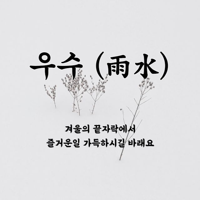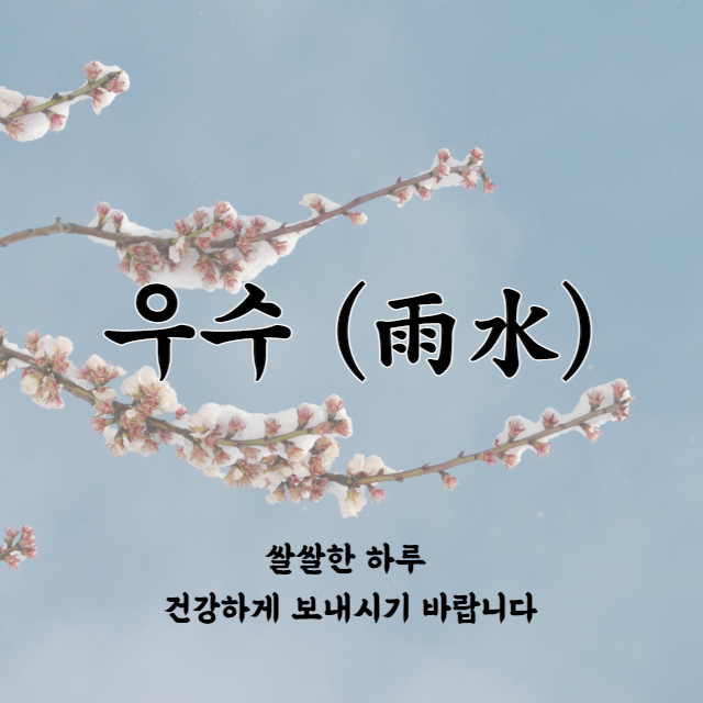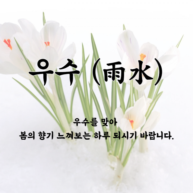 우수 인사말 이미지 뜻 음식 풍습 등을 총정리해보도록 하겠습니다. 오는 2월 19일이 벌써 우수입니다. 우수는 24절기 중 두 번째 절기로 봄에 들어선다는 입춘과 동면하던 개구리가 놀라서 깬다는 경칩 사이에 있는데요,
