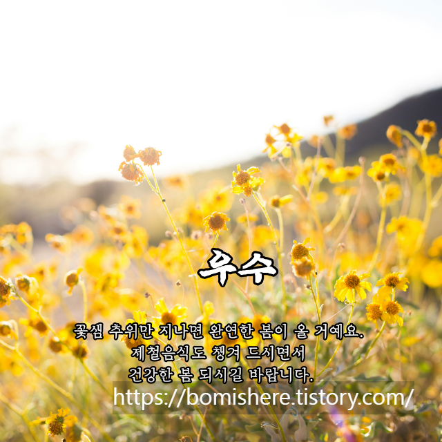 우수 뜻 날짜 인사말 이미지를 정리해보도록 하겠습니다. 오는 2월 19일은 입춘 15일 후에 찾아오는 24절기 중 하나인 ‘우수(雨水)’입니다. 우수는 양력 2월 19일경에 찾아오며, 날씨가 풀리고 봄바람이 불기 시작하며 새싹이 난다고 전해지는 24절기 중 하나인데요,