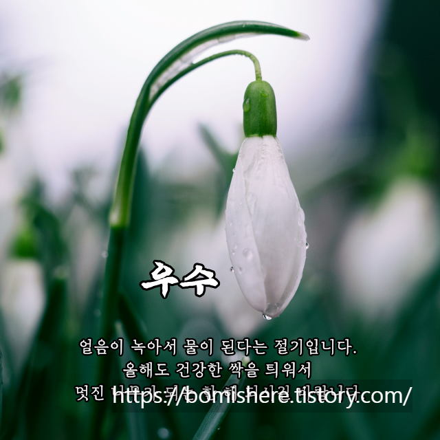 ♡ 우리나라의 아름다운 전통 중 하나인 우수입니다. 봄비가 내림으로써 자연을 살리는 이 시기에 우리도 우리 주변을 살펴보며 소중한 것들을 지켜나가는 시간이 되었으면 좋겠습니다.