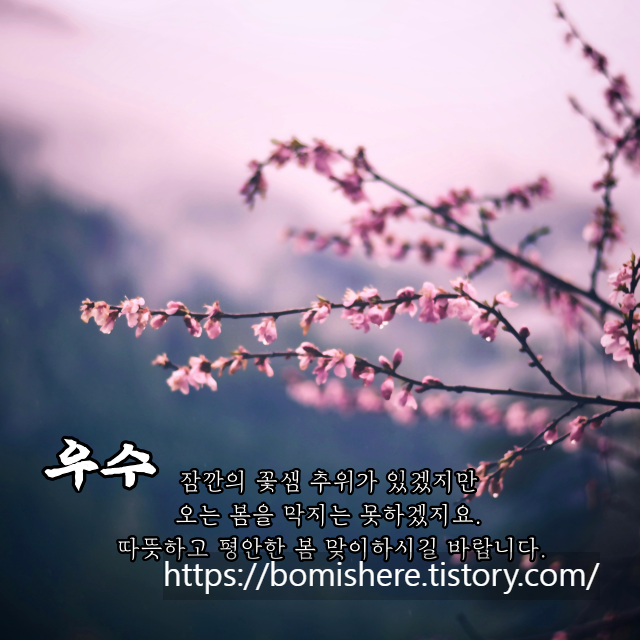 ♡ 우수에는 봄비가 시작되어 새로운 시작과 희망을 상징합니다. 지난 겨울의 추운 기운이 떠나가고, 따스한 봄날의 기운이 찾아오듯이 새로운 일들에 도전하며, 좋은 결과를 이루시길 바랍니다.