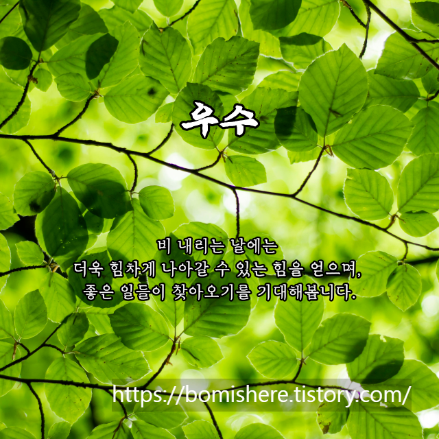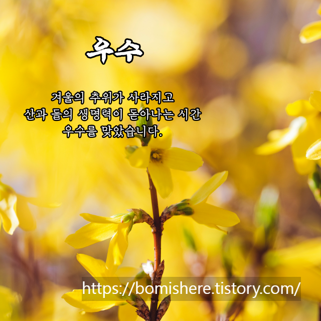 ♡ 우리나라의 아름다운 전통 중 하나인 우수입니다. 봄비가 내림으로써 자연을 살리는 이 시기에 우리도 우리 주변을 살펴보며 소중한 것들을 지켜나가는 시간이 되었으면 좋겠습니다.