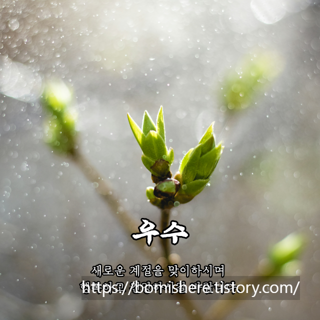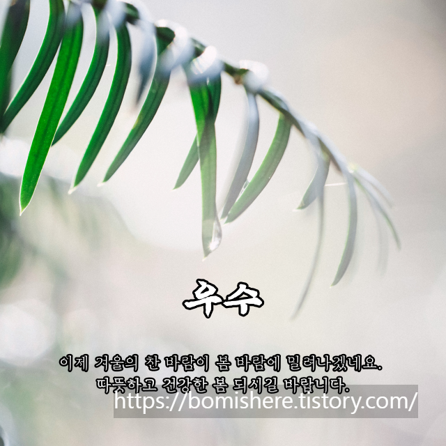 우수 뜻 날짜 인사말 이미지를 정리해보도록 하겠습니다. 오는 2월 19일은 입춘 15일 후에 찾아오는 24절기 중 하나인 ‘우수(雨水)’입니다. 우수는 양력 2월 19일경에 찾아오며, 날씨가 풀리고 봄바람이 불기 시작하며 새싹이 난다고 전해지는 24절기 중 하나인데요,