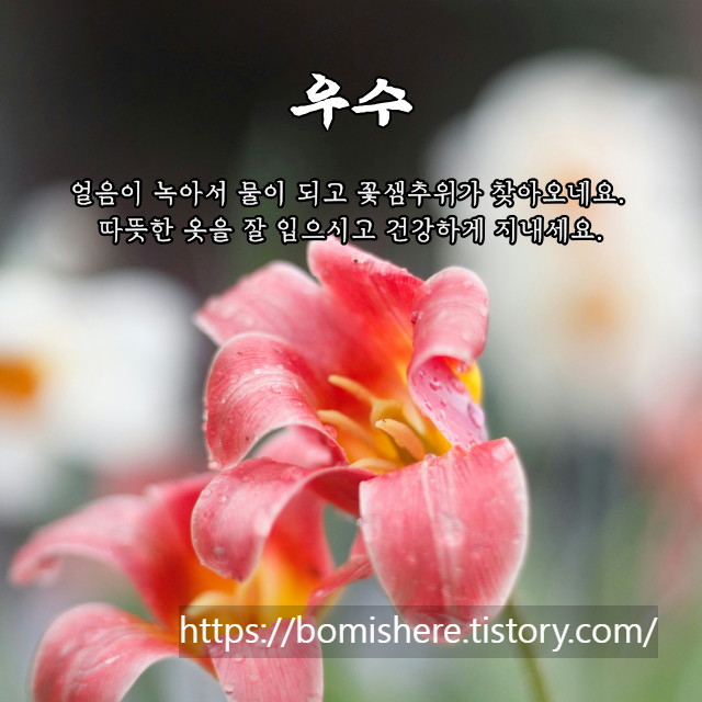 우수는 눈이 녹아서 비나 물이 된다는 날을 뜻하는데 그 말의 의미처럼 날씨가 곧 풀린다는 시기이니 '우수나 경칩에 대동강 물이 풀린다'라는 말이 있듯 우수가 지나면 이제 날이 점점 따뜻해질 것입니다. 다가오는 새로운 계절, 꽃과 나무 그리고 풀들이 서서히 봄을 맞이하는 모습을 즐기시길 바랍니다.