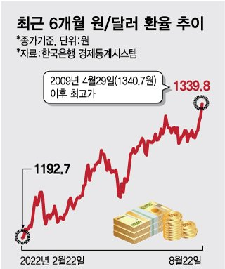 최근 달러 강세 흐름을 보면 우선 지난 6월 23일 1,300원대에 올라선 이후 지난달 6일과 15일 각각 1,310원, 1,320원을 차례로 깨며 고점을 높여왔는데요, 8월 22일 1330원선까지 치솟았습니다.